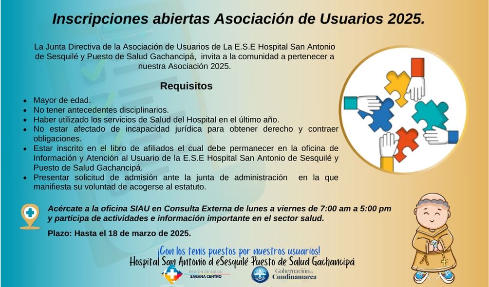 La Junta Directiva de la Asociación de Usuarios de la E.S.E Hospital San Antonio de Sesquilé y Puesto de Salud Gachancipá, invita a la comunidad a pertenecer a nuestra Asociación 2025.