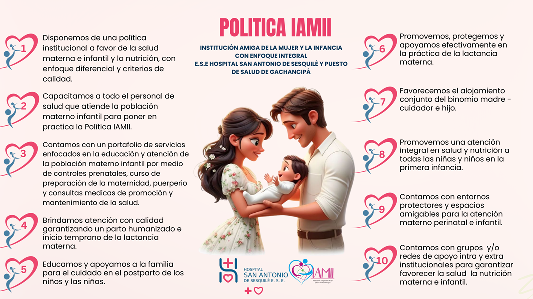 En la E.S.E. Hospital San Antonio de Sesquilé y Puesto de Salud de Gachancipá, trabajamos día a día para ser una institución con atención integral de la salud materno-infantil, teniendo como base los 3 pilares IAMII: