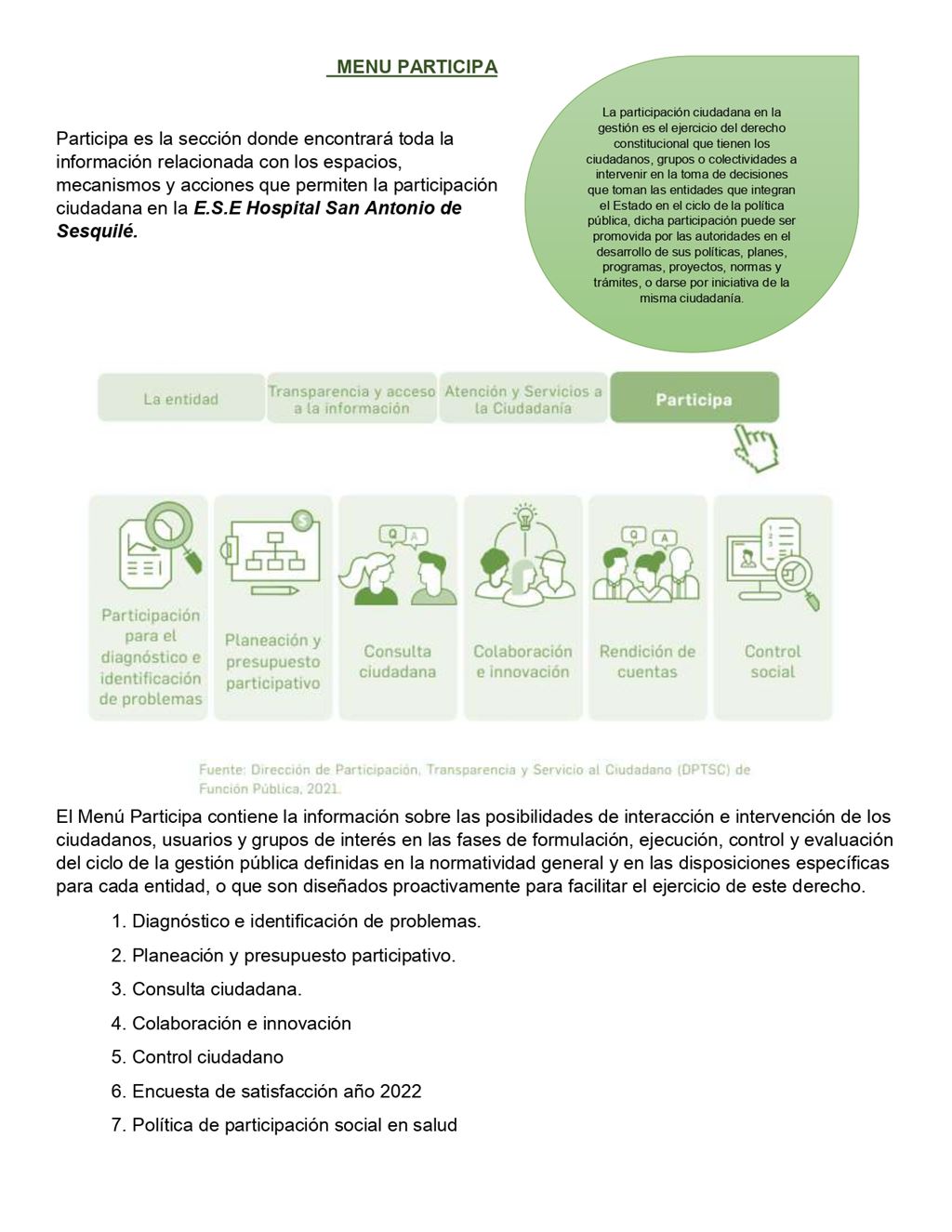 Participa es la sección donde encontrará toda la información relacionada con los espacios, mecanismos y acciones que permiten la participación ciudadana en la E.S.E Hospital San Antonio de Sesquilé.